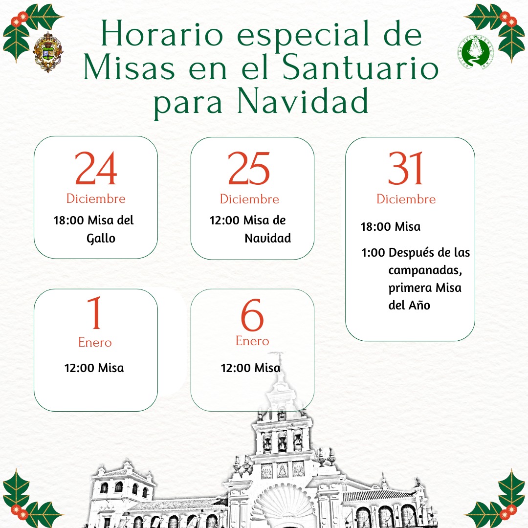 𝑯𝒐𝒓𝒂𝒓𝒊𝒐 𝒆𝒔𝒑𝒆𝒄𝒊𝒂𝒍 𝒅𝒆 𝑴𝒊𝒔𝒂𝒔 𝒆𝒏 𝒆𝒍 𝑺𝒂𝒏𝒕𝒖𝒂𝒓𝒊𝒐 𝒅𝒆 𝑵𝒕𝒓𝒂. 𝑺𝒓𝒂. 𝒅𝒆𝒍 𝑹𝒐𝒄𝒊́𝒐 24 de diciembre, Misa del Gallo a las 18:00. 25 de diciembre, Misa de Navidad a las 12:00. 31 de diciembre, Misa a las 18:00 y primera Misa del año a