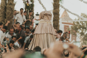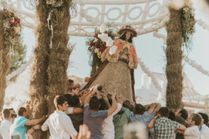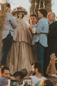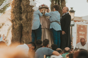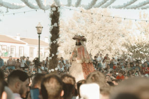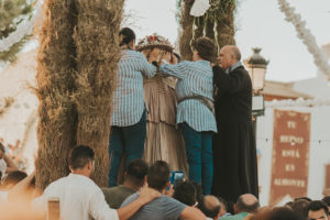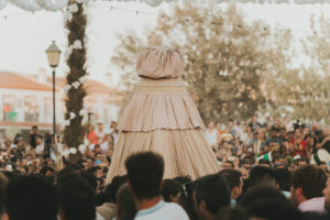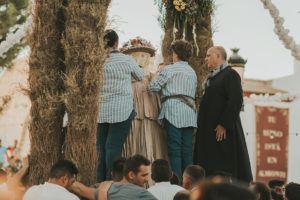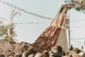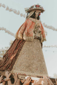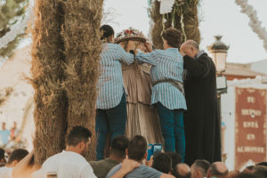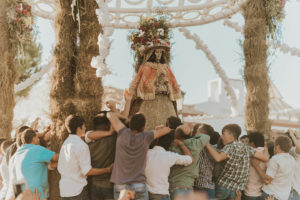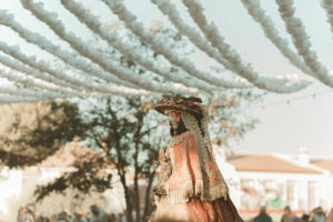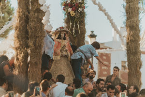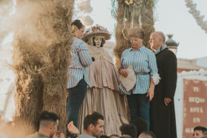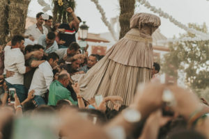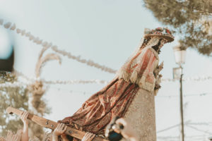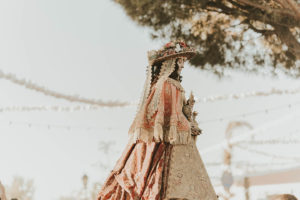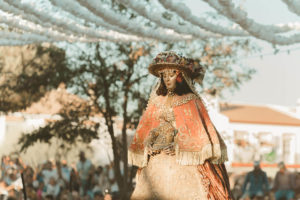 Sobre este sagrado altar sus camaristas com mimo cubren su divino rostro con paño de encaje fino y un capote marismeño la protege del camino